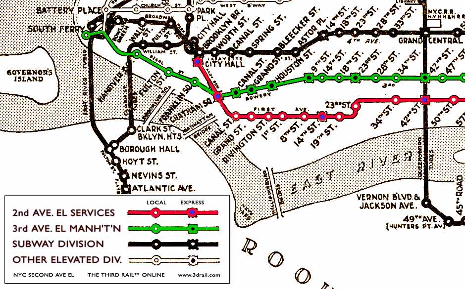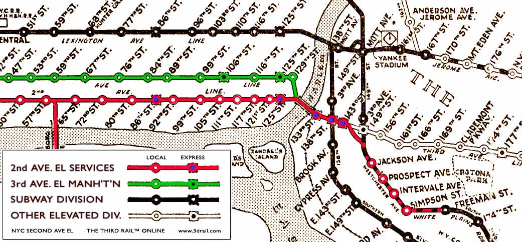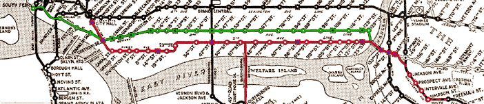 The Second Avenue El (in red) was closely paralleled by the Third Avenue El (in green) for most of the length of Manhattan Island. Its stations tended not to be on the same streets as the Third's, and it provided the only direct downtown service for Astoria and Corona Line riders in Queens. Still, it never had as much service or patronage as the Third, providing additional justification for its removal. Some have pointed out that the Second had the more durable structure, so that it should not have been removed in favor of the Third, which itself closed in 1955, leaving the East Side chronically underserved. Click the map or links for larger map versions: Downtown (114K); Midtown-Queens (148K); Uptown-Bronx (107K). |